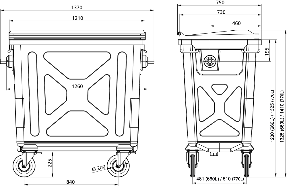 Großraummüllbehälter aus Stahl, mit Flachdeckel 660 / 770 / 1100 L
